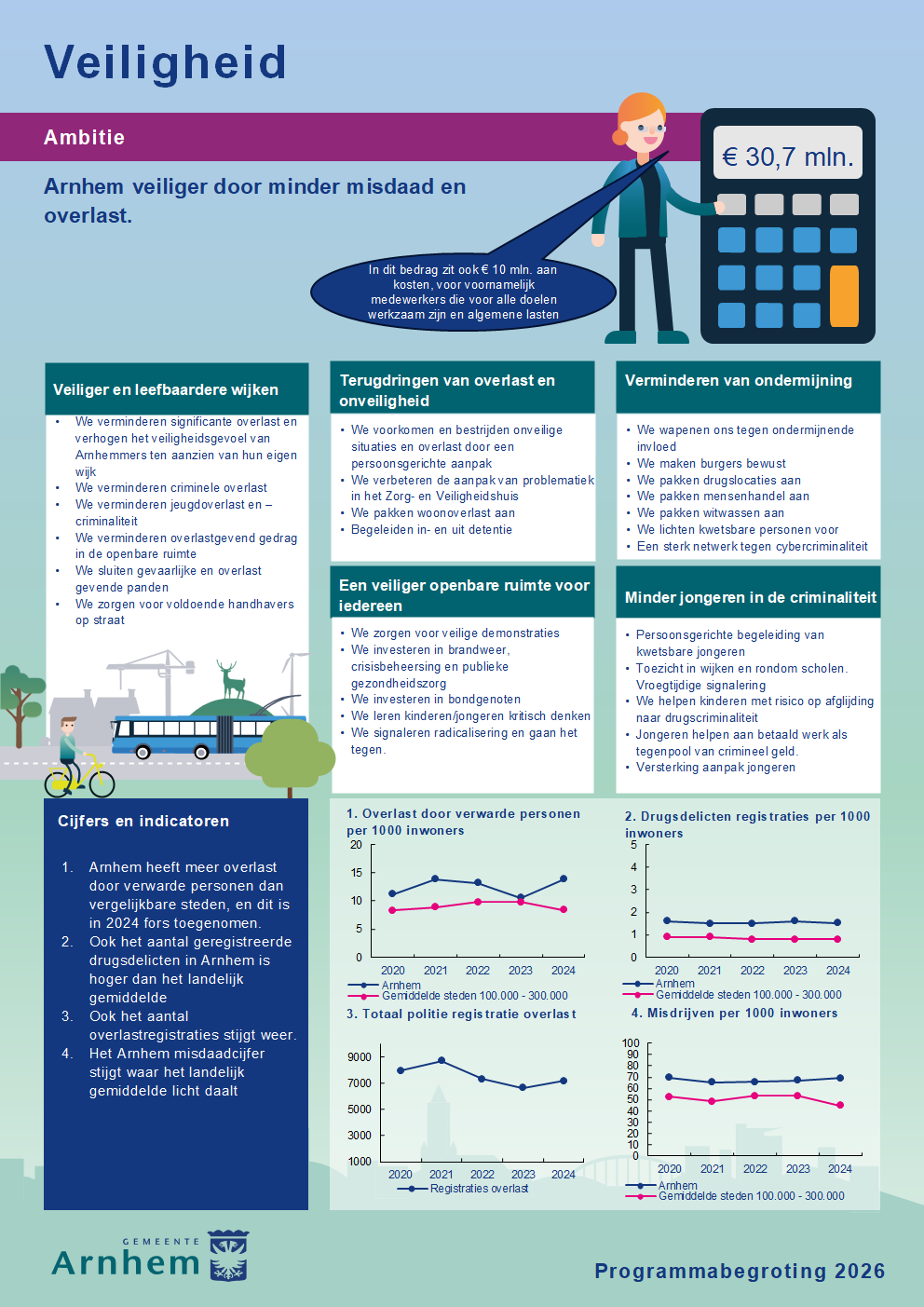 Arnhem veiliger door minder misdaad en overlast | Meer bewoners ervaren dat hun wijk veilig en leefbaar is | We verminderen significante overlast en verhogen het veiligheidsgevoel van Arnhemmers ten aanzien van hun eigen wijk |