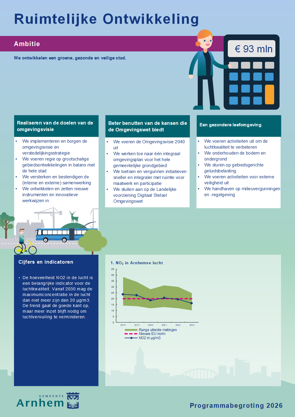 Voorwaarde voor de ontwikkeling van de stad is dat onze leefomgeving aantrekkelijk, veilig en gezond blijft voor huidige en toekomstige inwoners. Daarom werken we vanaf 2025 de omgevingsvisie Arnhem 2040 uit in een samenhangend beleidsplan voor een gezonde en veilige leefomgeving, een duurzaam mobiliteitsplan, een woonvisie en een stedelijke visie op hoogbouw en verdichting. Zo zorgen we voor een goede kwaliteit van leven in onze stad.
